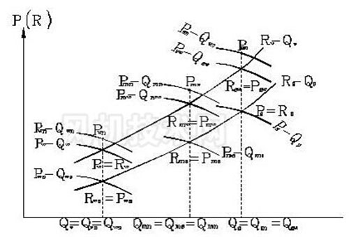 圖中:Rw-Qw,Rs-Qs分別為管網在冬季和夏季的管網特性曲線,Pwn-Qwn為按冬季運行工況選擇的風機特性曲線。Pw-Qw為該風機在冬季運行時的特性曲線,Pws-Qws為該風機在夏季運行時的特性曲線。其余依次類推。